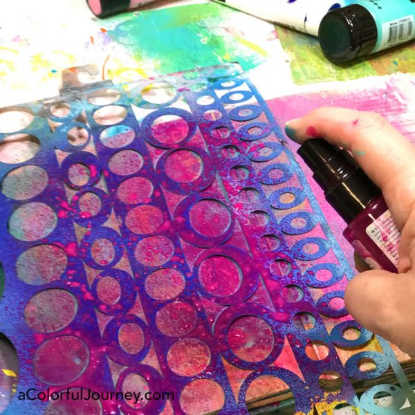 The Mod Ovals and Circles stencil was calling to me, and yes, I really heard it beckoning me to use it on this page! The Art Spray was extra wet and juicy since I went a bit heavy handed with it and sprayed generously.