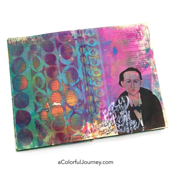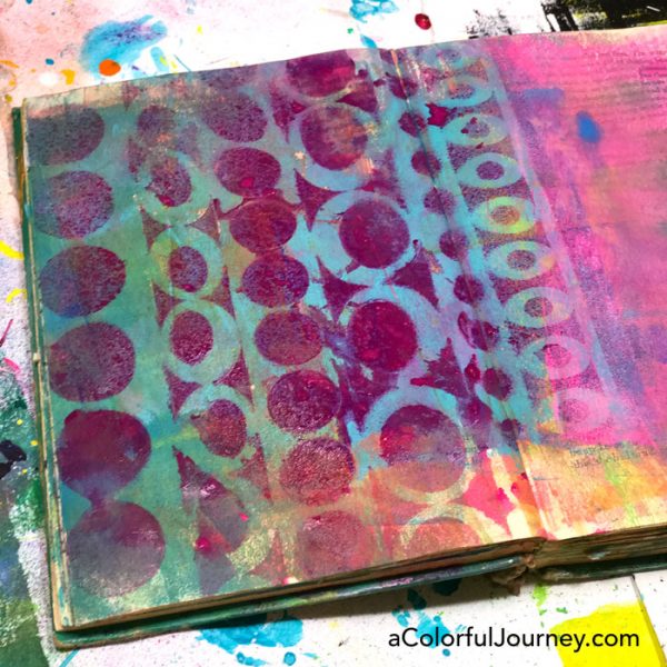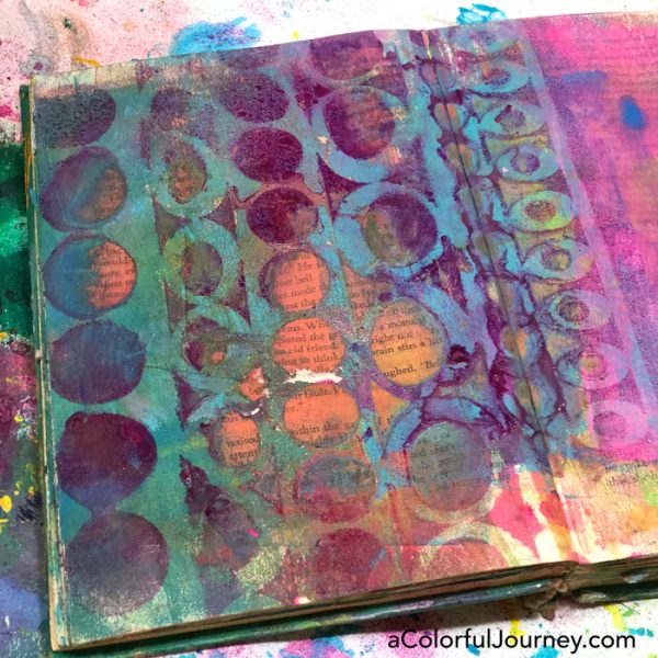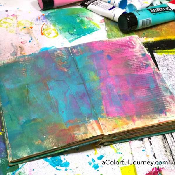 When you have to clean off a tool, say like a brayer while gel printing, clean it off on an art journal page.  This way not a drop of paint is wasted and you’re getting a start on your next project.  That’s how the background happened in an altered book journal.