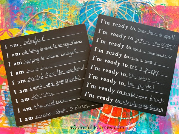 Interactive murals are those that have chalk (or markers or paint) nearby so that everyone and anyone can participate. My favorite are the big fill in the blank kinds. But that isn’t practical to create indoors, so I created mini ones. It will have the look of chalk, but there is zero chalk involved (so no chalk dust) or special paint!