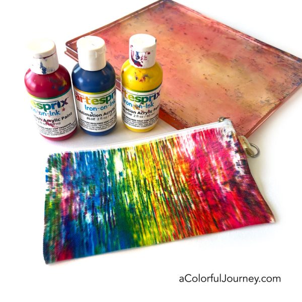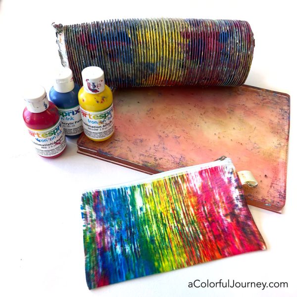 Take a gel print and fuse it into fabric? You can with sublimation paint by Artesprix and a Gel Press plate! The image isn’t painted onto the pencil bag, it’s permanently fused into the fabric! The very fancy pattern making tool I’m using to create the print is a dryer vent from the hardware store.