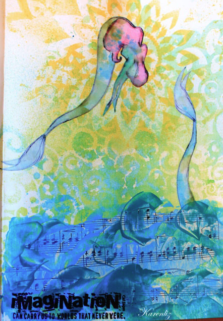 Karenliz has made magic with the mermaid above (drawn by my daughter). She created more movement with the addition of the 2nd tail and gave this mermaid a colorful world to swim in with spray inks, stencils, and that fun pop of pink! Clicking on the artists’ names will take you to their full blog posts.