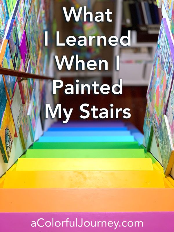 At long last, this year, I finally updated my painted stairs. These are the stairs I walk on every day to get to the studio and now that they’re colorful, I wonder why it took me so long to make time to do this! What I learned and the OOPS or two along the way are all in the video.