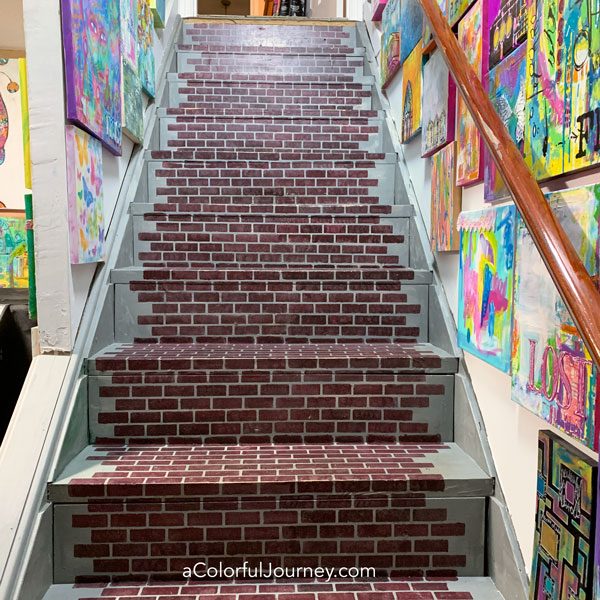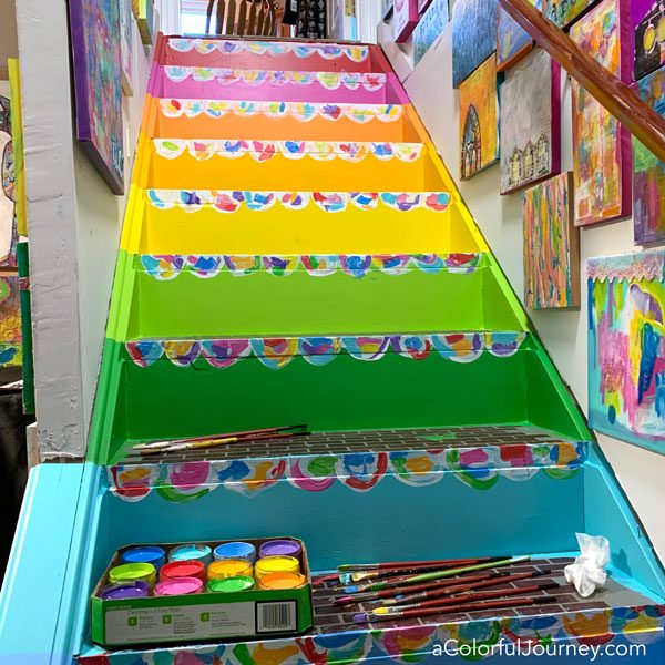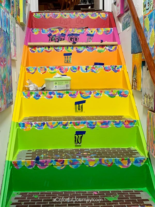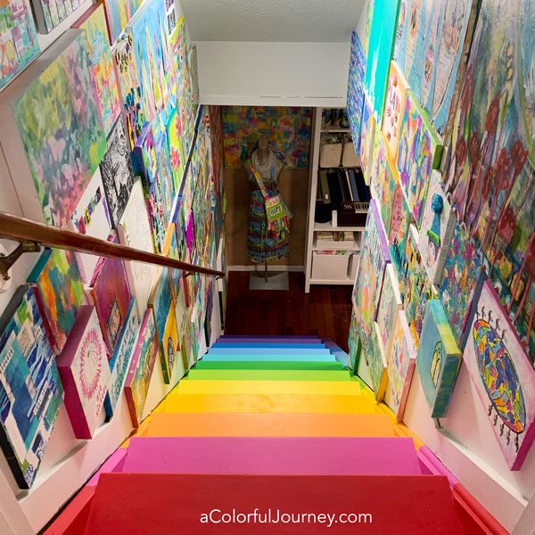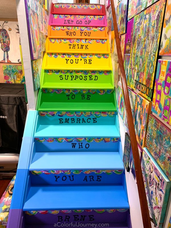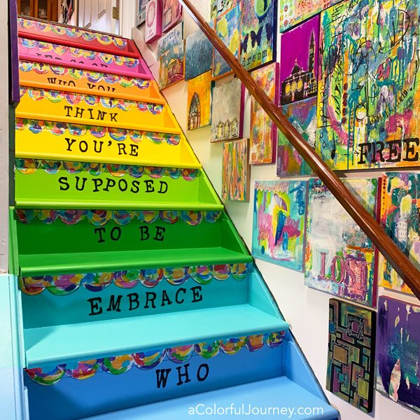 Thank you for sharing your so full of life stairs! I’m going through all my art materials and “getting organized in my studio. I only hope! My studio is in the basement. I painted my stairs years ago with a painted center carpet runner in shades of purple and bright yellow surrounding it. I painted simple illustrations of trips I took… the paint is getting worn so thanks for the support and reminder and I love the quote!