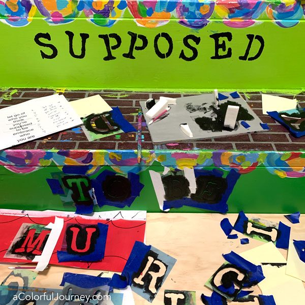 To make it easy to stencil the words, I cut apart the Vintage Typewriter Alphabet Jumbo stencils (A-P & Q-Z) that I designed for StencilGirl. Then I taped them on with painters tape.