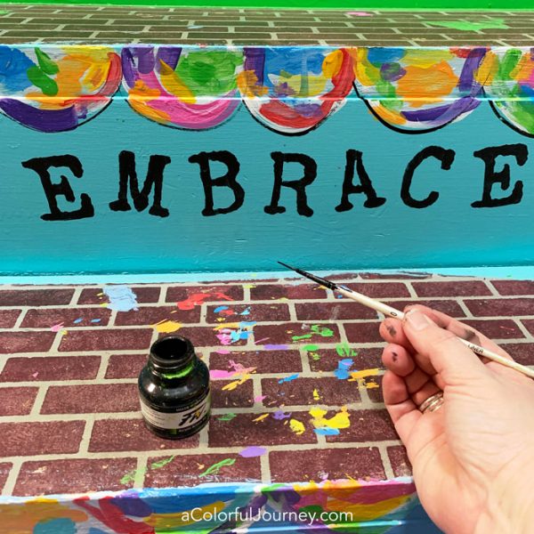 The risers won’t be walked on so use whatever you have on there. I didn’t buy black floor paint so what could I do? I used what I had, which was black acrylic paint that I use in my mixed media art. The finishing touches on the scallops were so much easier to do with ink than paint. Nobody will be walking on the black so it isn’t a big deal.
